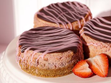 Strawberry filling, on our classic graham cracker crust. Topped with milk chocolate & a drizzle of pink white chocolate.