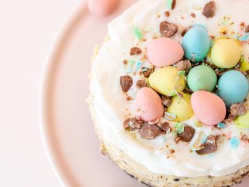 An oreo crust, with our classic flavour and crushed mini eggs throughout. Topped with fresh whipped cream, and more mini eggs.