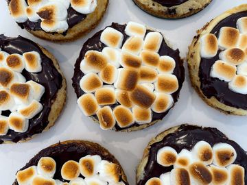 A graham cracker and chocolate crust, with brown sugar cream cheese filling, topped with a decadent chocolate ganache; and perfectly toasted marshmellows!